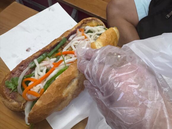 住所をタクシーの運転手さんに告げて、この辺に美味しいバインミー屋さんがあるんだって?と話しかけると、