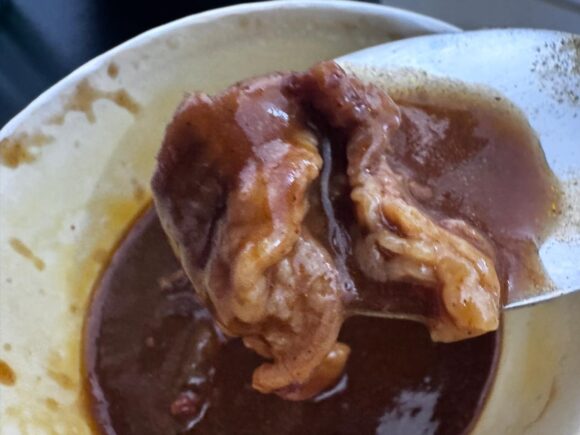 で、ルーの量がたっぷりだったので具材の様子が最初わからなかったのですが、正直期待してなかったんですよ。ぶっちゃけソースだけでも充分かなと。