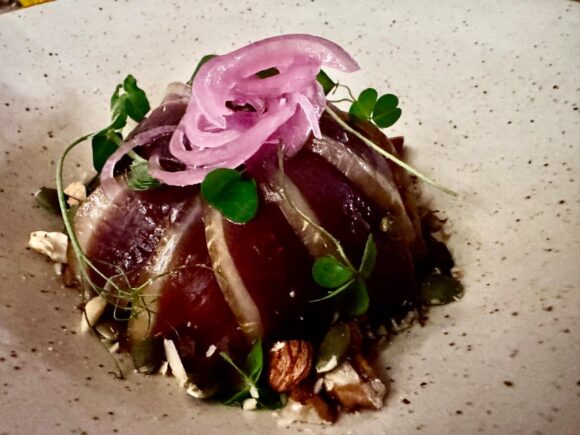 そもそもくどくない良質の脂を湛えたトラウトに、良質のオリーブオイル。ちょっとライムが効いてて爽やか。