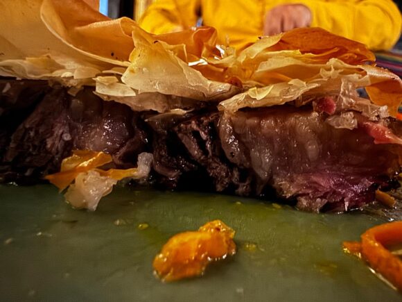 それを薄くフィロで包んだ上で、表面に帯状にしたフィロをあしらいオーブンロースト。その部分は、ナイフを入れるとおフラジャイルなクラック音を放ちながら崩れていきます。