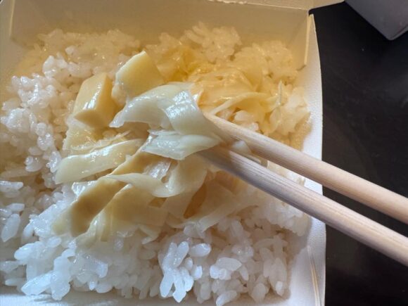 メンマ、みたいな感じではなくあっさりとした塩筍。え、これ美味しい。これをもっとドバーッとかけて、ご飯食べたいw