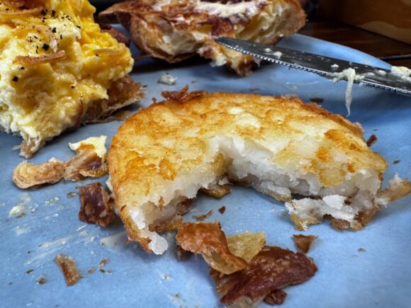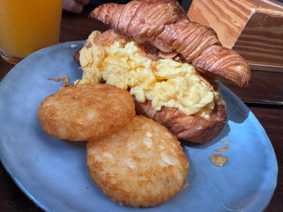 こちらはなんてことのない、クロワッサンのスクランブルエッグ。に、ハッシュドポテトを、Add on メニューから足してるんですが。。。