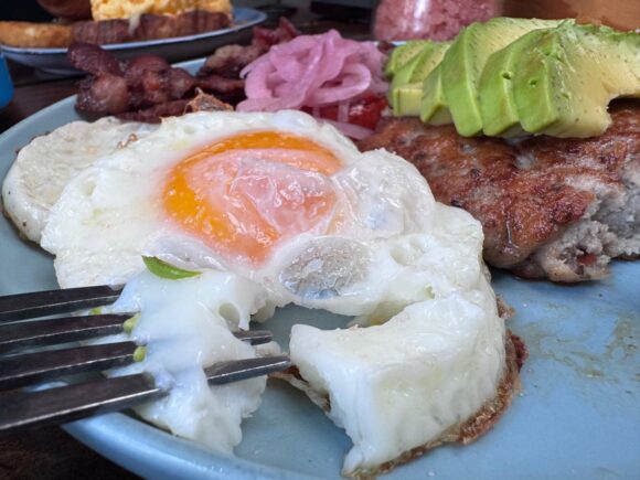 目玉焼きを、米やパンの主食ポジションに持ってくるとちょうど良い。アヴォカドも乗ってるし、いい感じいい感じ♪
