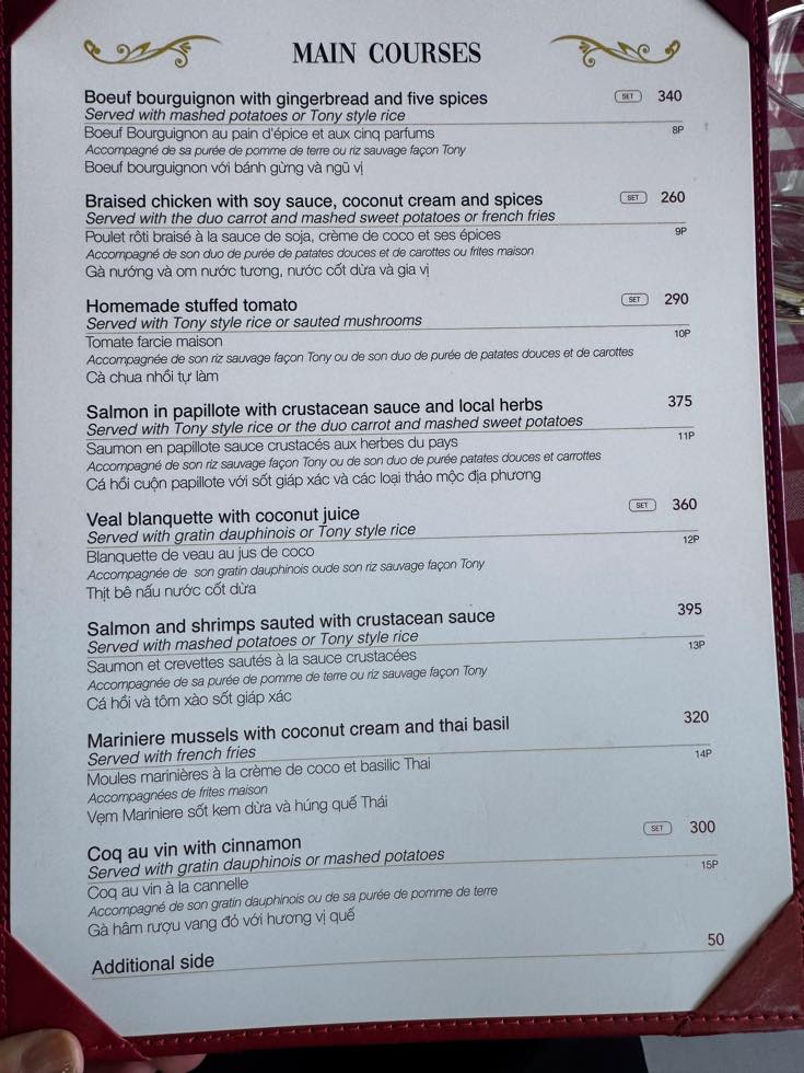 昼夜同じで、スターター、メイン、デザートのセクションからそれぞれれらんで、単品オーダーにするか、セットメニューにするか。