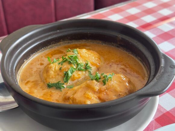 海老のビスクみたいなのかな。アメリケーヌソースで代用することもあるらしい。それをたっぷりかけてオーブンで焼くと、ソースは沸々、クネルはぷんわり、愛嬌が良くなってくれるらしい♪