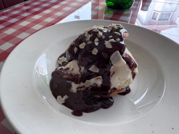 アイスクリームをシュー側に詰めて、あたたかいチョコレートソースをかけた定番。