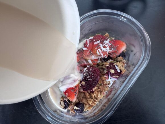 グラノラはオートミルクがカップに別に入ってきて、ヨーグルトとお揃いの容器に入ってました。