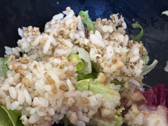 食べる場所によって、たっぷりのレタスをベースとしながら、ここはカニカマ、ここはオリーブ、ひよこ豆が時々ボリューム感を出してくれて食べ応えがある、など、非常に楽しい。