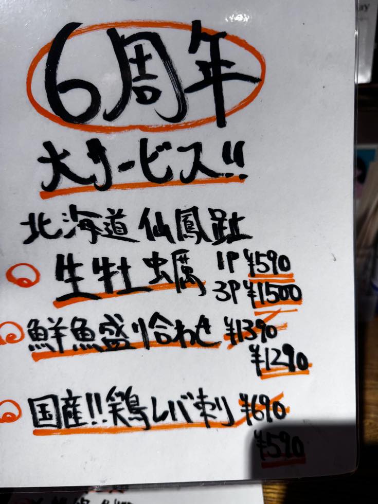 で、こちらのお店、6周年らしく、サービスメニューも色々と。
