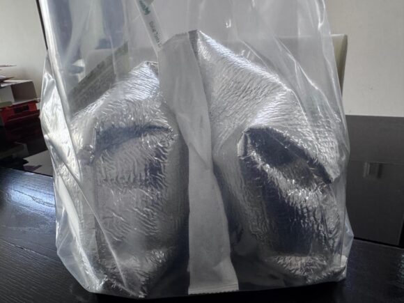 ご覧の通り、厳重に保冷対策がされてやってきました。お店を出発してから、我が家に到着するまで15分強位だったかな?とは言え、暑い日だったので、中がどうなっているのかは気になるところ。