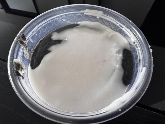 外側には、若干すりつぶされ残った黒胡麻の食感がある濃い層があり、中には滑らかな黒胡麻プリン。
