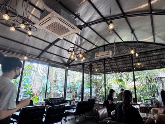 ナチュラルなのが好まれるのは、エアコンに関しても同じで、彼らは暑くても日が照ってても、お外が好きな方が多い。ので、こちらも表の席がメインです。
