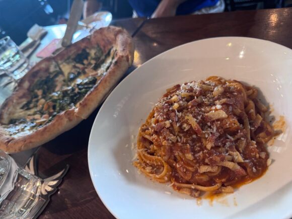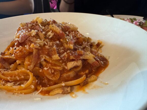 トマトソースにチーズを散らしたアマトリチャーナ。トマトソース料理を置いてるお店ではチェックせずにいられないので、今回はパスタで。