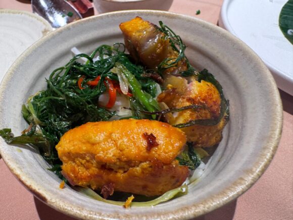 なんかメコン川ツアーの時に食べる機会がある、エレファントフィッシュのフライみたいなものもあるし、タコスみたいなスタイルのものもある。これは純粋なベトナム料理と言うよりも、フュージョンと言ったほうがいいのかな。