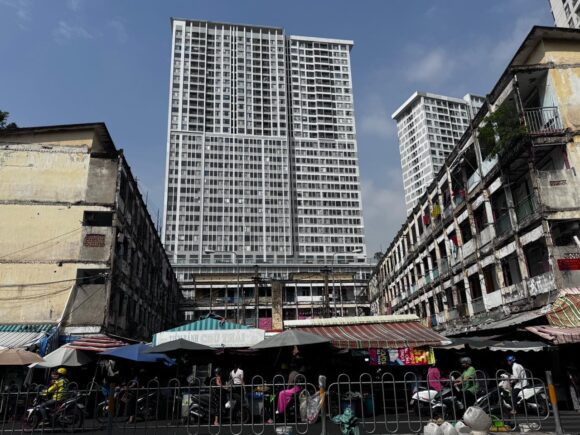 川沿いに建つ新品のマンションの裏手。年季の入った集合住宅が囲むように市を立ててる。