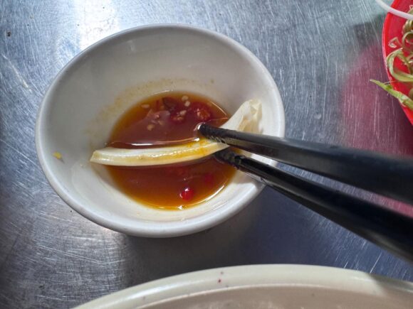 こうやって具材をつけて食べてもいいけど、中程でスープの中に少し入れてもいい。