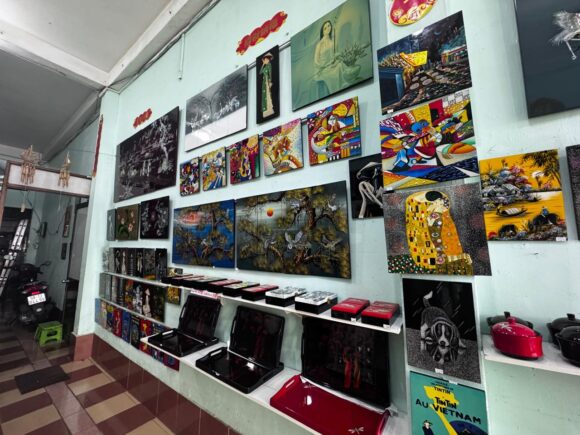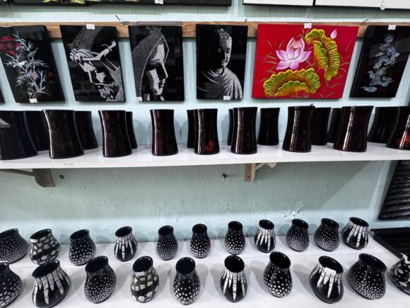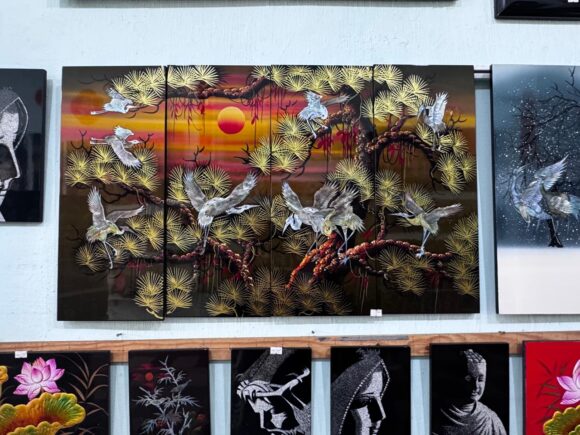 そう、ベトナムの現代漆器は、日本のそれとは違って、実にカラフルだったり、単に色を塗るだけでなく、卵の殻、アワビの貝殻(螺鈿)、金箔、銀箔などを埋め込む技法がとてもユニーク。