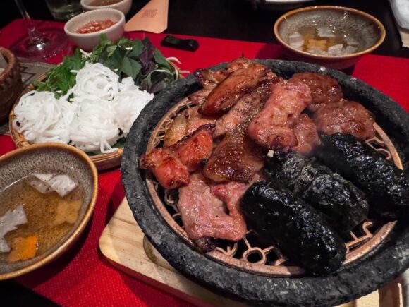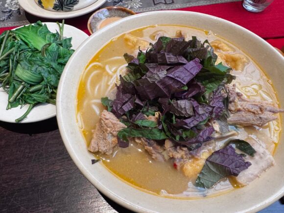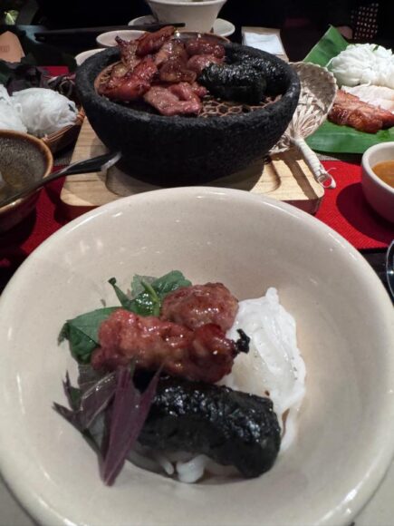 お好きなお肉類とブンという米麺、そしてお好きなハーブを小椀に取り分け、付属のタレを少しかけていただきます。美味しい。