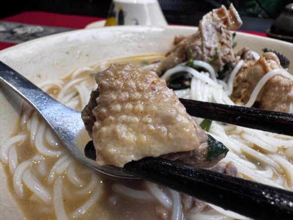 そんな優しいスープが、ツルツルの米麺に乗っかるのか?と思いきや、表面張力がうまいこと働いて、程よく乗っかる。すごいなあ。想像上では絶対あわない、と思っちゃうやつなのに。