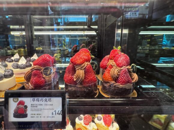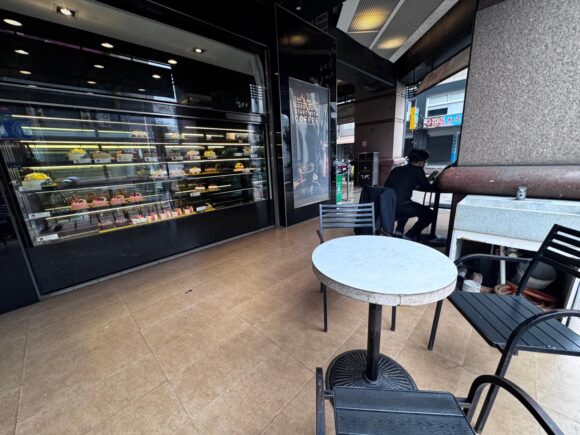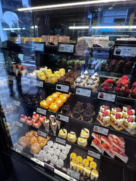 屋外の歩道部分にイートイン席は確認できてたので、ちょっと腰を下ろしてお茶したく、一旦外に出てさっきの角地にあるオーダーカウンターのところまで行く途中のショーウインドウにケーキがいっぱい!