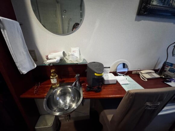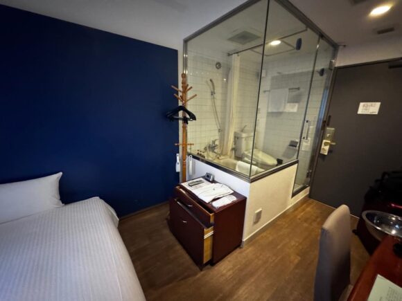 ロビーのクラシカルな雰囲気とはまたちょっと違ってて、ブルーの壁紙、ガラス張りのシャワールームなど(しかもブラインドなどもない)うん、やっぱりお一人様様だなw