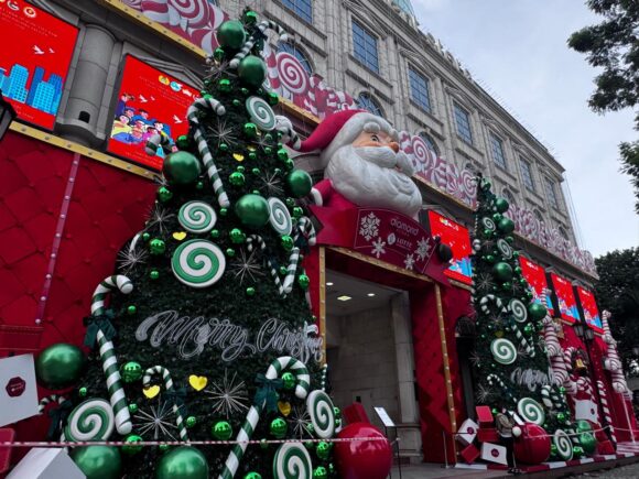 2025年11月現在既にクリスマスの飾り付けがエントランスをにぎわせています。ただし、今目の前の歩道が舗装作業に入っていたので、ちょっと写真は撮りづらいかもしれません。