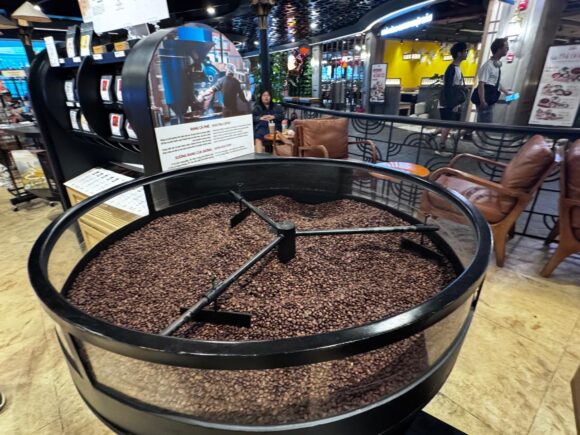 店内には、コーヒーをローストしているかのようなデザインの装飾物があったり、