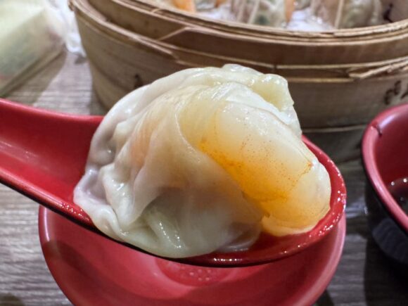 どんな包み方したらこの薄い皮でスープ漏らさずにいられるんだよ。。。しかも。。。エビ!でかいいいいい!!!😆