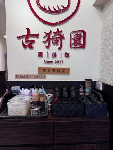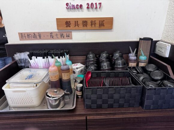 というわけで、お店に入って正面にある、先ほども掲載した写真の場所。ここ、店名ロゴのインパクト強くて見落としてましたが、小皿や調味料が置かれてるところでした。