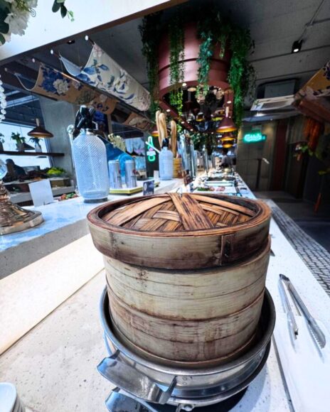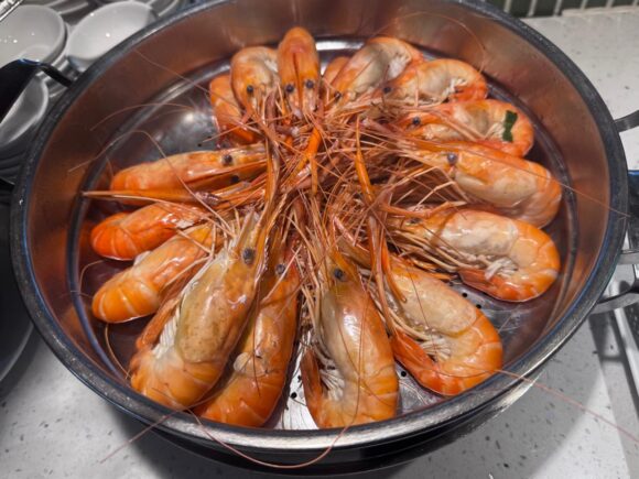 味は全体に控えめですが、大抵の場合、特にシンプルに蒸しただけのエビなどのそばには、調味料がいろいろ置いてあるので、それを取ってきて活用しましょう。