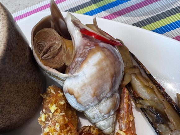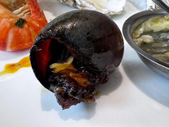 リンゴガイは、そんなに味がしっかりとある食材ではありませんが、こちらみたいに胡椒のソースやガーリック、バターなどと合わせているものがあって、結構おいしい。