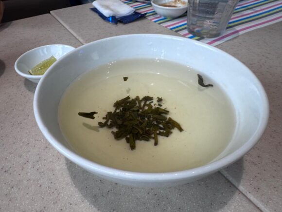 茶葉が入っているのは、ベトナムらしいというか、これにライムもついてきます。お茶のカテキンに殺菌作用・油除去作用などを期待し、ライムで香りを徹底的に取り去るという寸法。