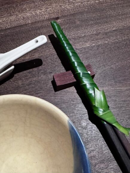 お箸包みが、いつも素敵よね。この葉っぱ、1日経つと乾いちゃうから、毎日スタッフさんが手で巻いてるんだと思う。
