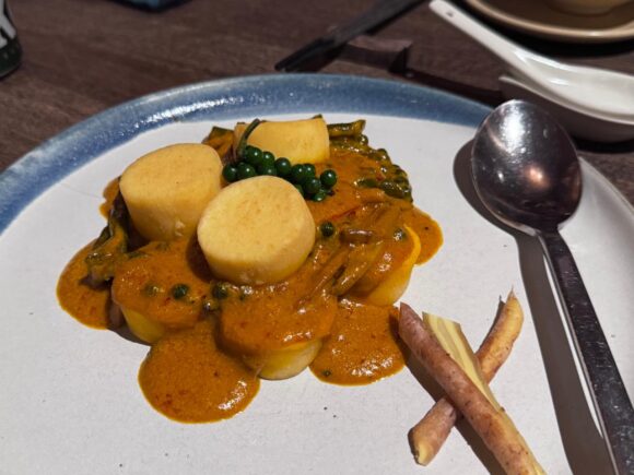 この料理の味は甘酸っぱく食べやすいのですが、珍しい野菜なども使われており、そもそも器に使ってるのがカカオポッドと言う、日本人にはとても珍しいものなので、テーブルにあると楽しいかも♪