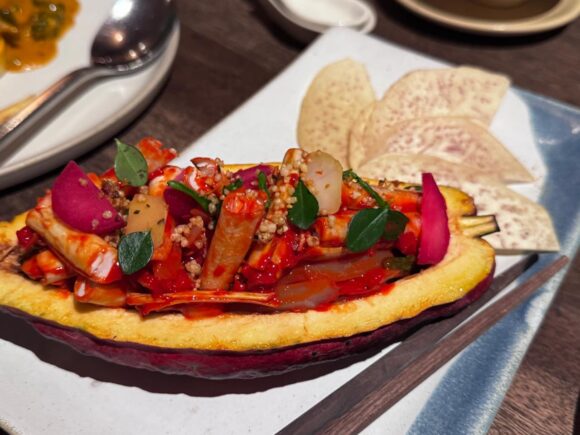 こちらは訳すとヨモギを使った卵巻きのようだったのですが、ヨモギの香りはそこまで強くなく、食べた感じは鶏や白身のすり身のようでもあり、でもここはベジタリアンだから肉のすり身は使ってないはず???あれ???となる美味しさw