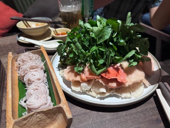 ベトナムの鍋のために添えられた米麺は、通常、手元の椀に取ってそこにスープを注ぐだけで食べられるのですが、この鍋に添えられた麺は、多分紫米を一部足したものでほんのりピンク。