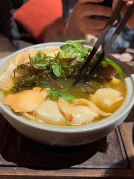 輪郭をはっきりさせるせいか、少し硬めに仕上げていた様子。ひと椀ごとに丸めてくれてるので、それをお玉に乗せ、鍋の中に散ってしまわないよう、お玉の上でスープに馴染ませ、そのままお椀に。