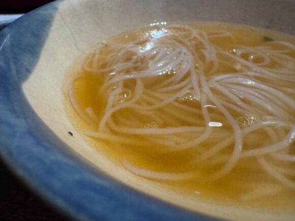 この細さの米麺はそのままで食べられますし、鍋に放つと行方不明になっちゃうので(笑)、手元のお椀に麺を入れて、そこにスープを注ぎます。