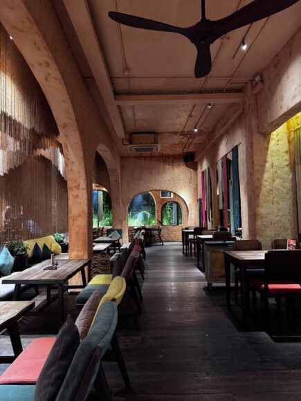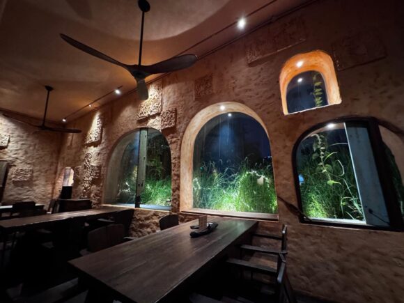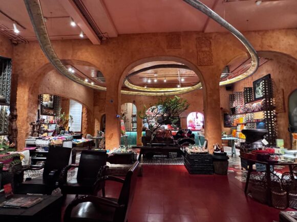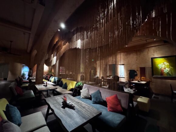 カラフルなたくさんの布を空気の流れにそよがせてるのですが、それは店内全体に施されている演出で、私たちが今回お邪魔した一角は、以下のような雰囲気。