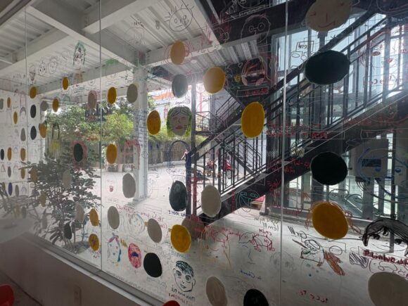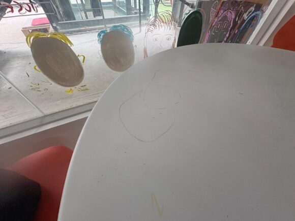 ガラスの窓にはお子さん方の手書きと思われる人の顔がたくさん描かれてて、微笑ましい。