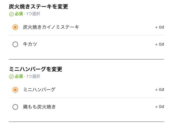 ミニハンバーグを鶏もも炭火焼きに変更することが可能。