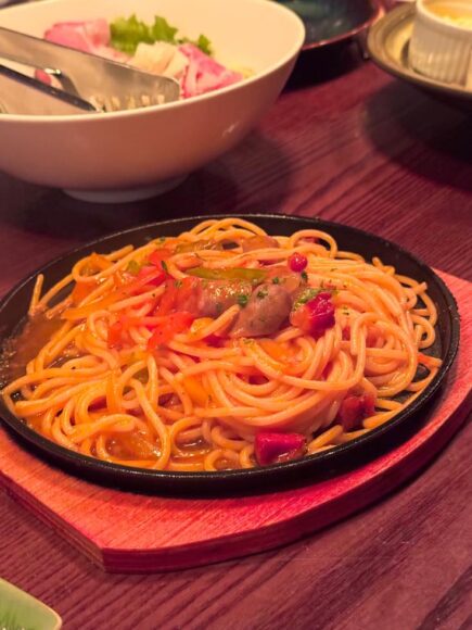 なんだろう。この鉄板に乗ってるナポリタンを見たら、自動的に甘いケチャップ味を想像してしまうので、少し意外な気はしましたが、大人あの集まりにはこれがいいのかも。