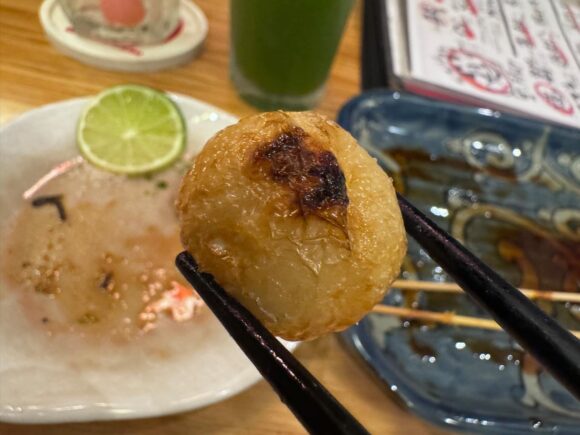 ふさが別れていなくて、ごろっと大きい。これが1串に2個、刺さってます。香ばしくて、中はねっとり・ホクホクとしてて、すんごい美味しい♪