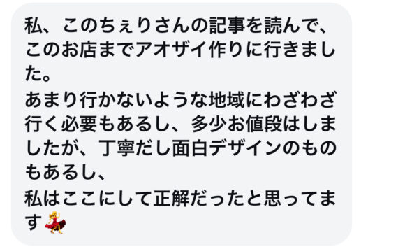 私が行ったわけでは無いのですが、今日ちょっとSNSのDMでお話をしていたところ、たまたまこちらの話題が出てきて、なんとなんとその方は以前こちらのお店を使ってくださったとのこと。