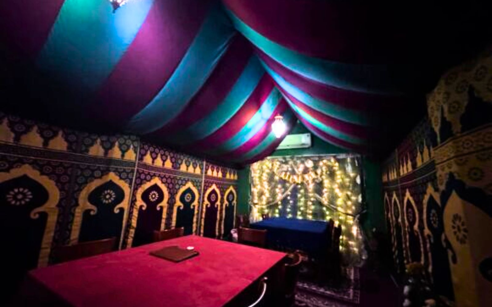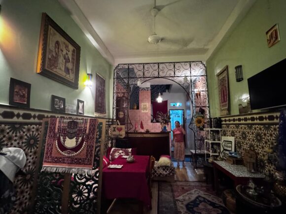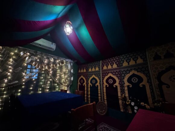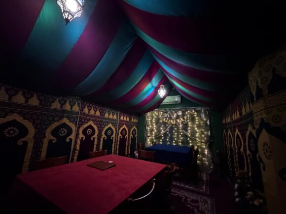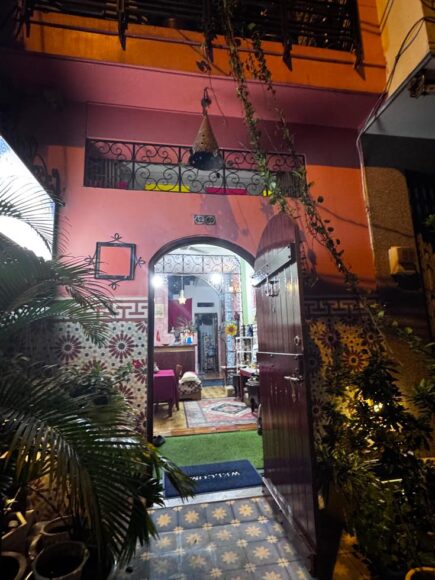 普通の住宅にあまり大きな手は加えず、でもモロッカンを思わせるファブリックやその他の小物を精一杯集めて演出してみました!って感じのエントランス。