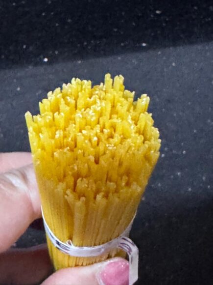 しかし、この麺の場合は水分を吸収する面が広く、麺全体の厚みがなるべくないようにと言う設計になっているので、アルデンテ、と言う状態は作りにくいので、どちらかというとマットな質感。