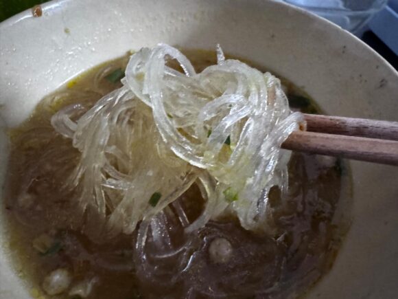 油で揚げてる麺は、麺についてる酸化した油の匂いが気になるし、米麺も、ものによっては酸味のある風合いが残るので別ゆでにするですが…(茹でた湯は捨てて、スープには新しいお湯を使う)