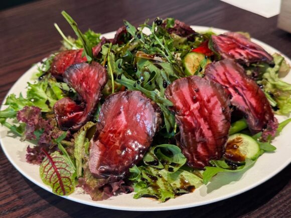 ドレッシングがバルサミコのちょっと甘めのやつで、葉っぱとだけ食べると、その甘さが目立つので、お肉と一緒に食べることを推奨。