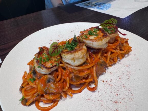 ローズクリームソースで和えられている、ローカル向けだから、柔らかめのパスタなんだけど、そこは洋食屋さんなので、ナポリタンを食べる感覚で行けば違和感なし。