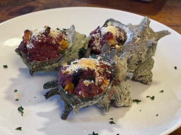 これがちょっとベトナムの貝料理を思わせる手の入れ方で、一旦取り出した身をカットして殻の中に詰め直してれる。